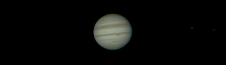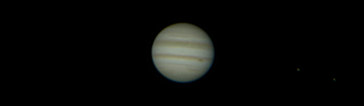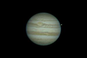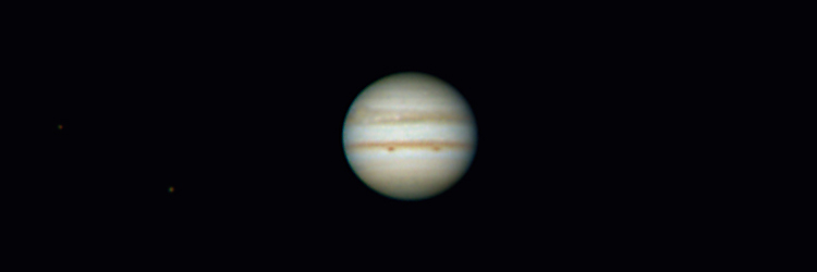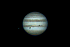 The shadows of Ganymede and Io transit Jupiter at 12:20 am CST
