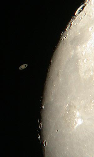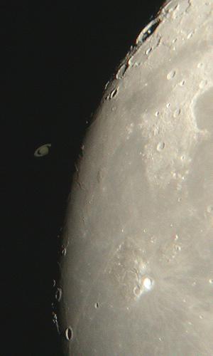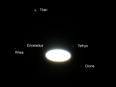 planet Saturn. Also labeled are Dione, Rhea, Tethys, and Titan.